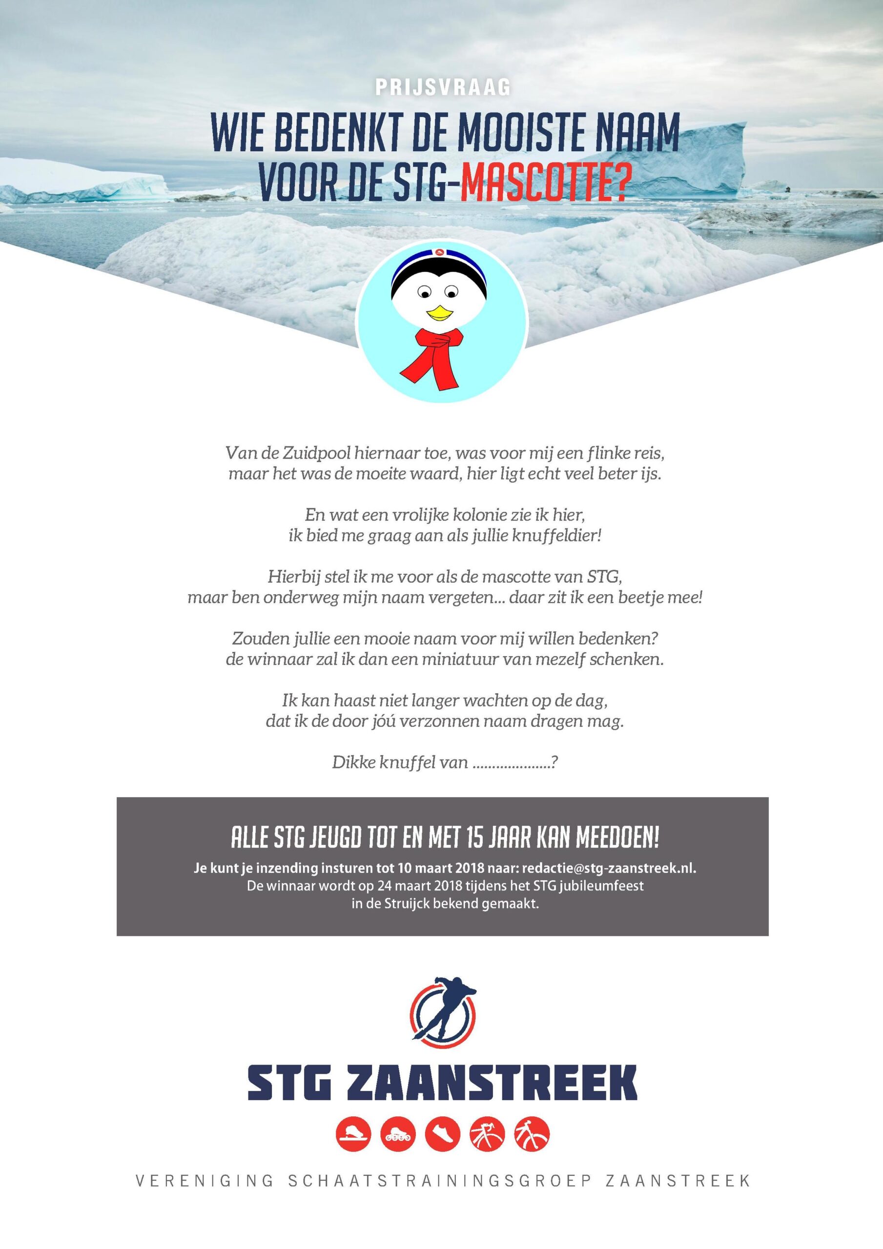 - Prijsvraag mascottenaam: Ook onze mascotte is natuurlijk van de partij, skeelert mee en is altijd in voor een fotomomentje. Nog steeds is de mascotte tijdens de reis vanuit de Zuidpool de naam vergeten. Daarom: wie bedenkt een nieuwe naam? We hebben al mooie namen binnen gekregen op 13 januari maar wil je meedingen naar de prijs (een echte minivariant van de mascotte!!!) stuur jouw idee inclusief je eigen naam en leeftijd naar redactie@stg-zaanstreek.nl. De prijsvraag staat open voor alle STG-leden tot en met 15 jaar.