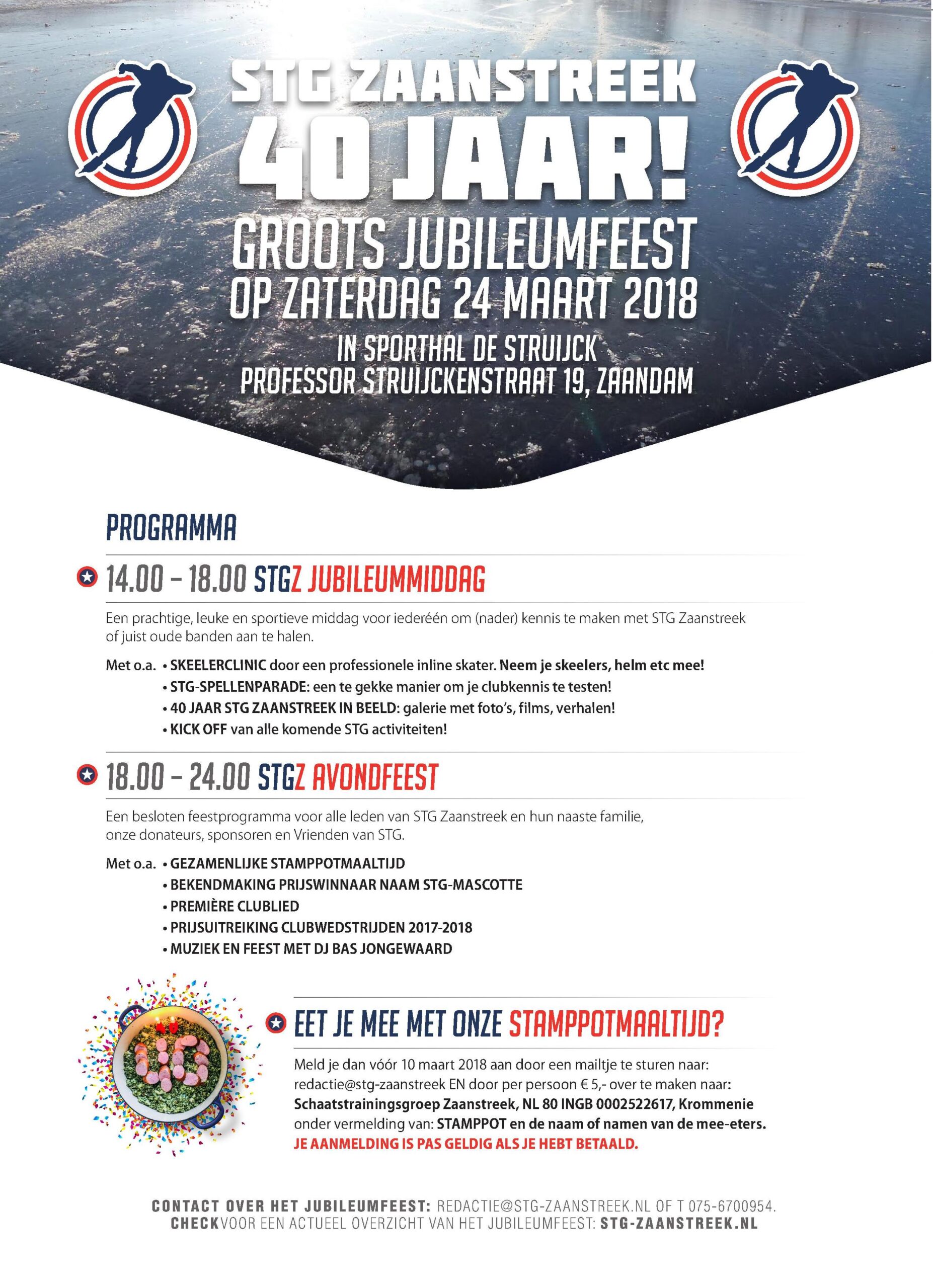 - én door €5,00 per persoon over te maken naar Schaatstrainingsgroep Zaanstreek, NL 80 INGB 00 02 52 26 17 onder vermelding van STAMPPOT en de naam of namen van de mee-eters.