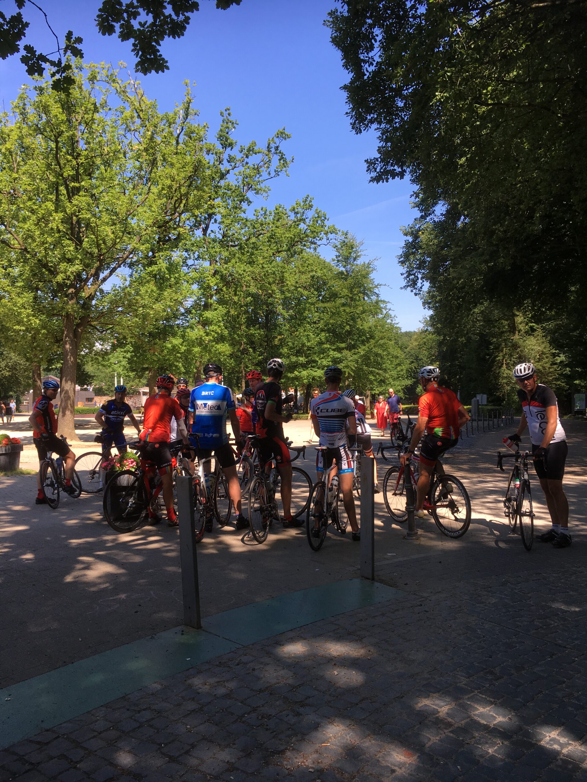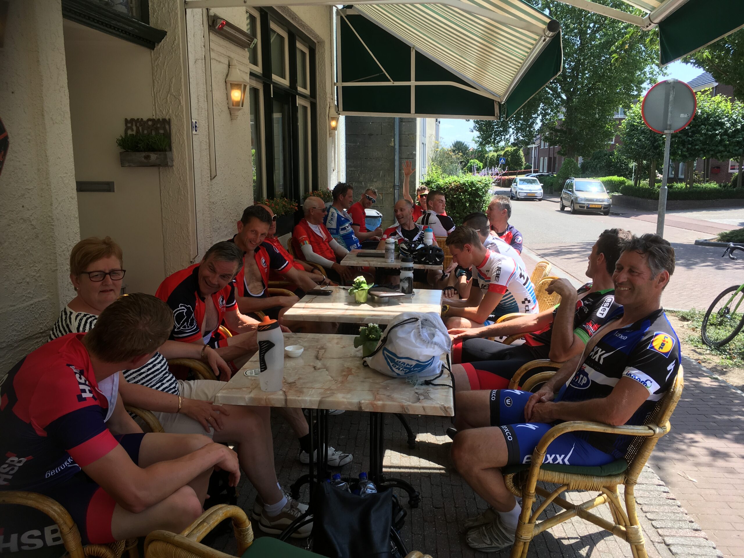 Met 16 renners gingen- ondergetekende, als debuterend bijrijder, naast Coby Bobeldijk zitten -om de groep 130km renners te begeleiden. Iris en Martin Meerhoff zaten in de volgauto van de groep die 80km gingen rijden. We reden langs plaatsen als Mheer, Noorbeek en Slenaken richting het drielandenpunt in Vaals- met prachtige uitzichten, maar zeker voor de renners venijnig steile klimpartijen, maar daarna natuurlijk super strakke afdalingen van o.a. Niels en Rick van Assema. Mark Peters, Erwin Dekker en Rob Schaap trapten stevig door en deden echt niet onder voor de jongeren en ook Cees Rijkhof en Wim Boekel bleven in elkaars wiel rijden. Via Holset, Mechelen en Partij naar Schin op Geul- via de altijd lastige Keutenberg- maar altijd nog met overwegend grote grijnzen op het gezicht -wordt de route afgelegd. John van Assema antwoordde op mijn vraag of het goed ging trots: “ik was als derde boven dus ik heb geen klagen”, hier komt dus toch enige competitie om de hoek kijken. Luuk Kleijne nam even een verkeerde afslag, maar was later wel degene die juist de goede richting koos. Onderweg gaf een chocoladereep Wessel Wouda weer energie en José een warme chocolade-handdruk, gelukkig waren er vochtige doekjes van Coby. Onderweg natuurlijk even gepauzeerd voor Limburgse vlaai met slagroom en een koffie, maar er werden ook omeletten en tosti’s geserveerd om alle mannen van de nodige energie te voorzien. Robin Schaap leek totaal niet vermoeid en bleef in de zon zitten om op te drogen. Helaas voor Albert Willemsen, hij kreeg pech aan de voet van de Eyserbosweg- problemen met de versnelling, hij heeft daar de groep moeten verlaten. Sven-Yvo kwam nog terug en heeft daardoor 2x deze klim moeten maken, maar ook de olie in een wit tasje kon Albert niet helpen. Met 15 renners verder via Valkenburg, Arensgenhout, Oensel naar Ulestraten. Michel Butter genoot ook met volle teugen van het Limburgse landschap en die heb ik alleen maar zien lachen. Bij Meerssen werd de 90km aangetikt en moest er toch wel even doorgetrapt worden om op tijd fris gedoucht aan tafel te schuiven. Maar rond 16.30 uur kwam iedereen gelukkig veilig aan bij camping de Bosrand in St. Geertruid, waar ook alle renners van de 80km waren gearriveerd. Camiel en Tibo deden nog even een laatste klim en kwamen een halfuurtje later. Camiel met zijn 11 jaar –de jongste van het hele spul-verdiend wel een extra vermelding: man man man wat ben jij een bikkel!