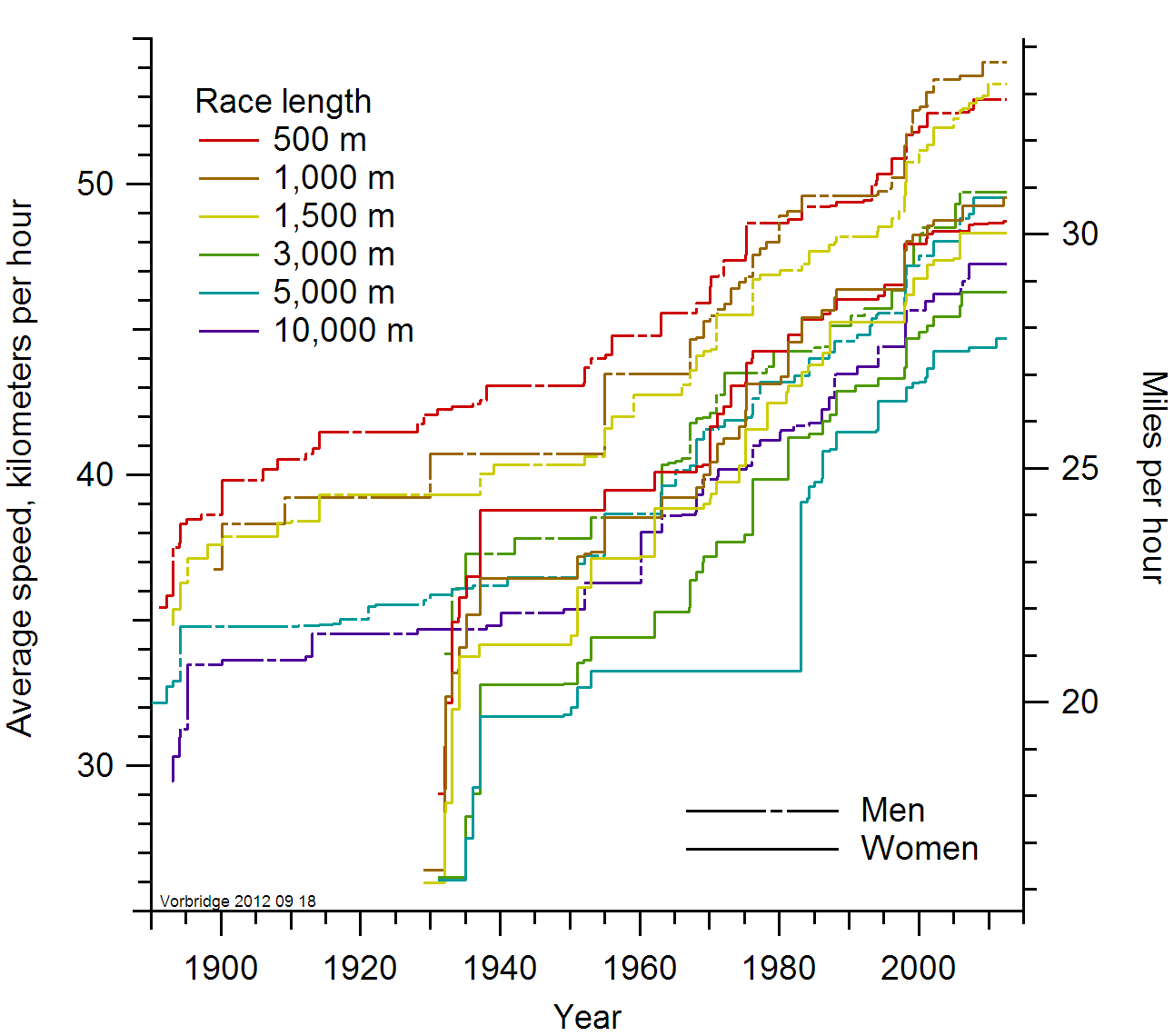 Mocht je je afvragen hoe je er in historisch perspectief voor staat, bereken dan de gemiddelde snelheid over je afstand en bekijk hieronder in welk jaar je hiermee een wereldrecord had kunnen pakken!