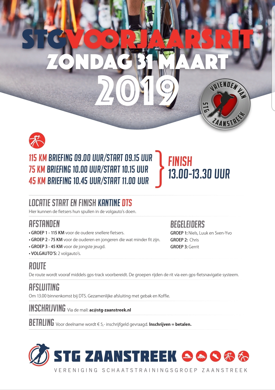 Op 31 maart 2019 wordt de tweede editie van de STG-Zaanstreek voorjaarsklassieker gereden. Een mooi begin van het voorjaar met een sociaal rondje op de fiets, en tevens een goede voorbereiding op de Ronde van Noord-Holland.