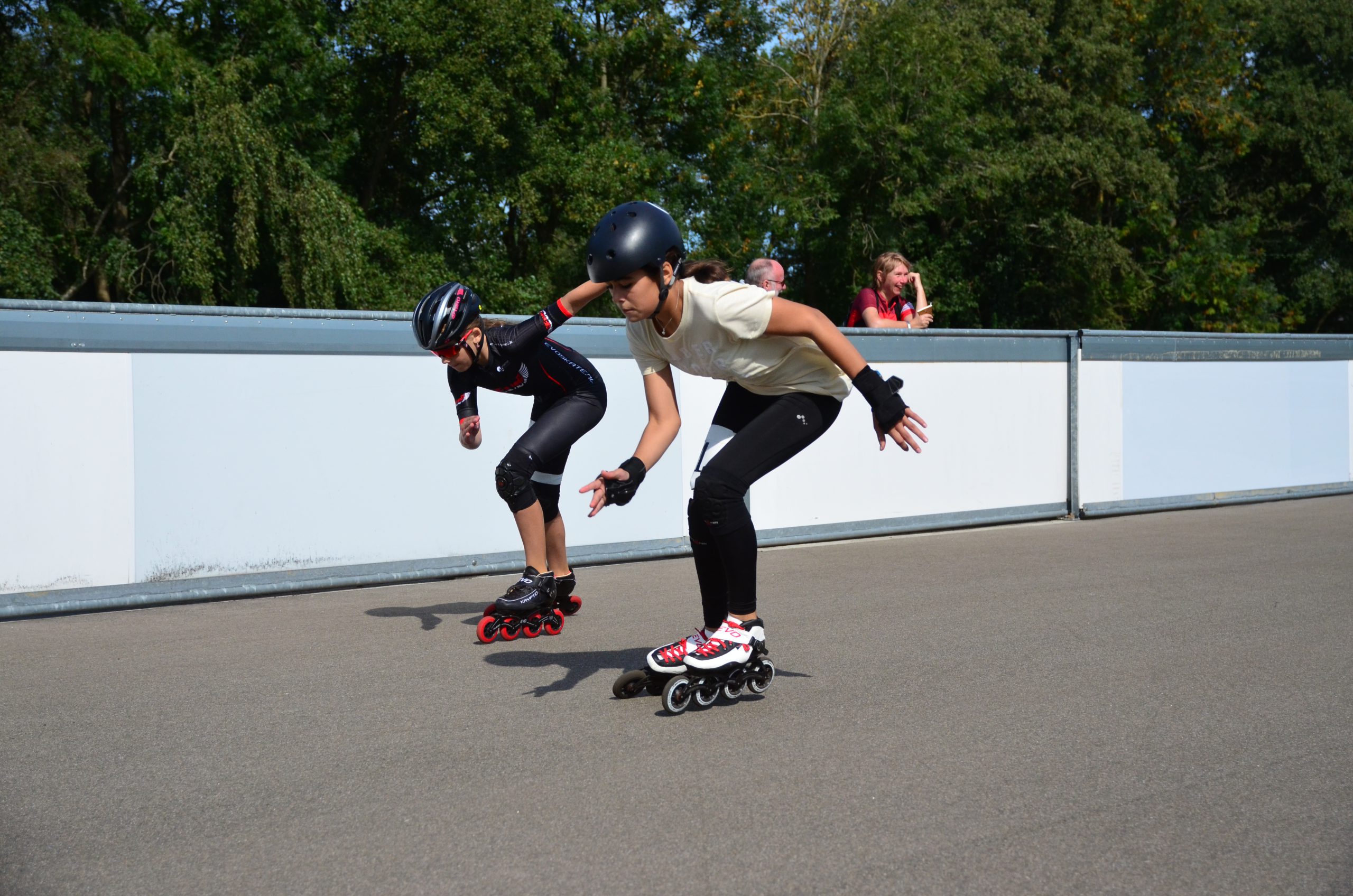 De junioren en senioren moesten per categorie voor de 1000 meter (5 ronden!) de skates onderbinden en zorgen dat ze in de laatste meter de concurrentie met tenminste één skate voorbij steken. Dat resulteerde in de winst voor weer Lionel, weer Kees en Sanne van Veen. Aparte vermelding was er voor Kees, die na 4 ronden vond dat het wel genoeg was. De attente speaker, Chris Schuurman, redde Kees nog door hem als Hilbert van der Duim aan te spreken met de legendarische woorden van Leen Pfrommer: “Jongen, je moet nog een rondje! Hilbert, doorrije”. In tegenstelling tot Hilbert, sloot Kees deze race wel winnend af.