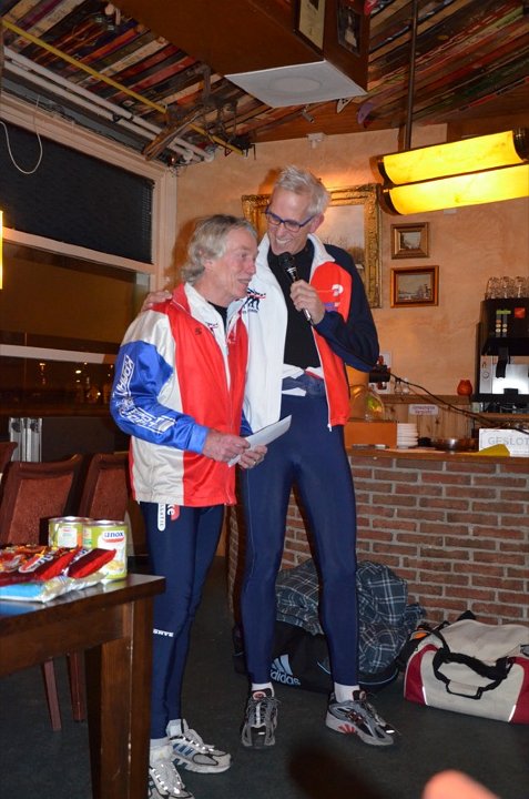 Verder was er nog een afscheid van het hoogste niveau (zie foto links bij dit artikel). Kees Kan heeft jarenlang vanuit het glazen huis hoog boven de baan zijn bijdrage geleverd aan de wedstrijden door op het juiste moment de klok in te drukken om bij uitval van de elektronica toch een resultaat te kunnen leveren. Een onmisbare schakel bij de wedstrijden gaat het nu toch iets rustiger aan doen, maar blijft wel schaatsen en een voorbeeld voor velen van ons te blijven. KEES KAN BEDANKT!