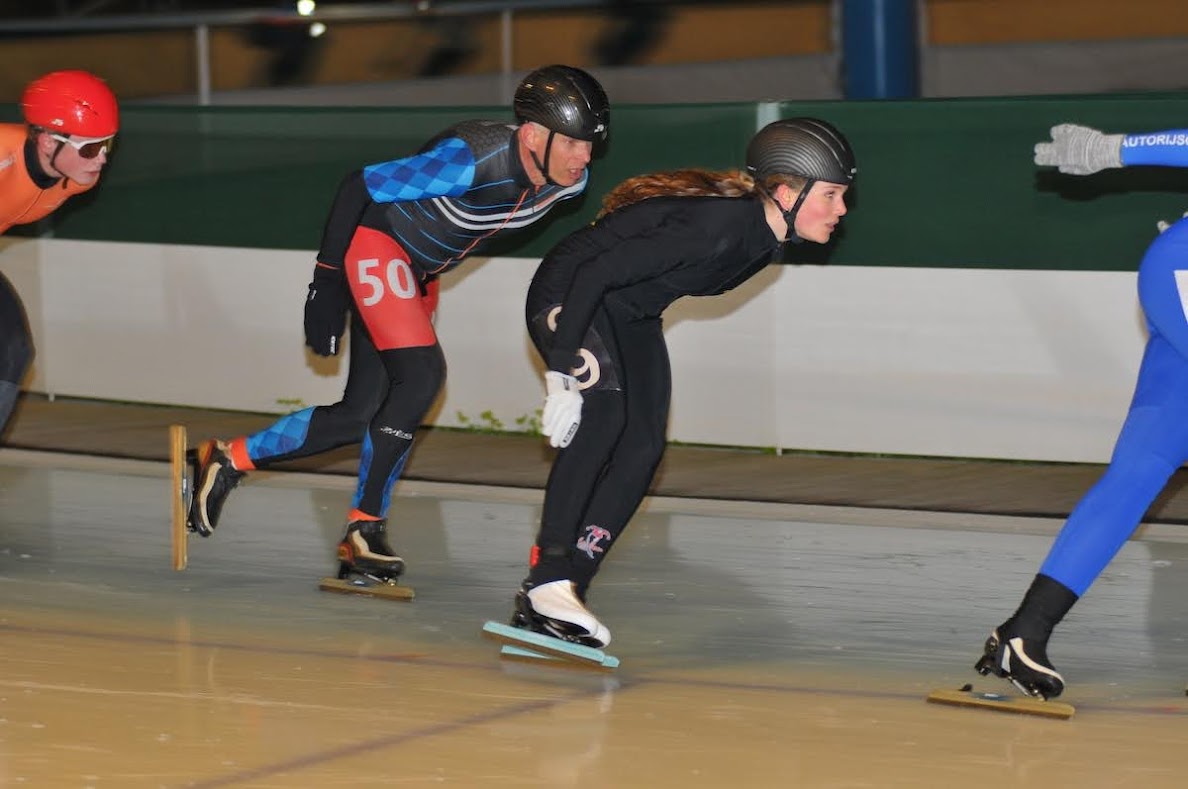 Daniel mocht als eerste starten voor Jongens pup B over 8 ronden. Met 7 man in de groep en vooraf samen de strategie bepaald ging Daniel van start; heel slim rijden en blijven zitten op de 3e plek. Daniel kwam met nog 500m te gaan bij uitkomst van de bocht zomaar aan kop. Ik zag hem vertwijfeld naar de kant kijken; wat gebeurt mij nou en wat moet ik doen? Er was maar één keuze, dat was volle bak door! Deze actie zorgde ervoor dat Daniel tot 75 m voor de finish nog op kop lag, maar door een misslag op het laatst, kwam hij als derde over de streep voor het kampioenschap van Haarlem. Daniel fantastisch gereden, mooie afsluiting van het seizoen en zoals iedereen op de ijsbaan zei: je doet niet meer onder voor de andere rijders en hoort gewoon bij de kopgroep en de kanshebbers in de marathon!