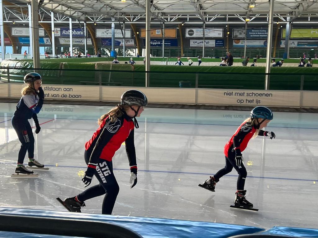 Na wat gedronken te hebben met de ouders in de kantine weer even via het ijs richting uitgang. MAAAAR daar waren de IJsberen en enkele B junioren bezig met hun wedstrijden waaronder 6 rijders van STG Zaanstreek en bij de klapdeuren werd mij gevraagd door 3 meiden van STG wat ik ga doen.