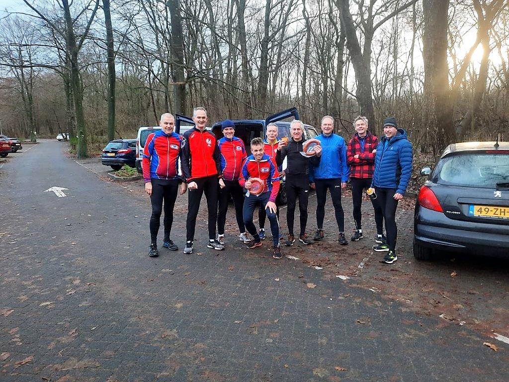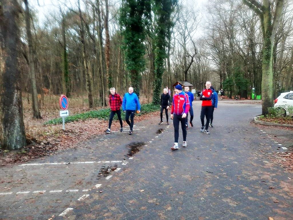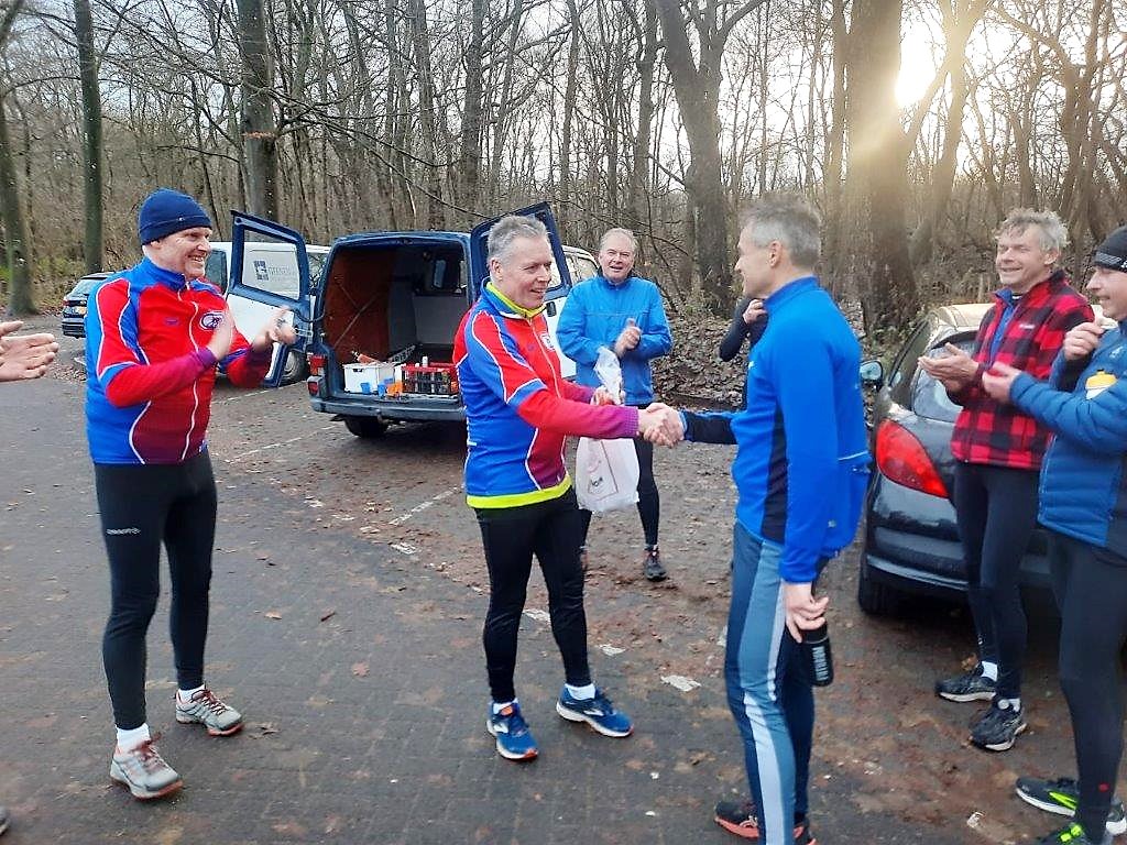 Aanvankelijk een beetje regen, maar alleszins goed loopweer en na een uurtje een poging gedaan te hebben om na al die jaren nog een desoriëntatie teweeg te brengen, gingen we uiteindelijk van start vanaf de Kruisberg terug naar Johanna’s Hof. Bert Bommerson en ik kozen voor de zuidelijke afdaling, de rest liep waarschijnlijk veilig achter Erwin Dekker aan. Aanvankelijk gingen we met z’n tweeën heel redelijk en pikten Jan van der Veer nog ergens in de afdaling op. Daarna moesten er echte keuzes gemaakt worden en ik wilde eens wat anders en belandde in een voor mij totaal onbekend caravanpark, met weliswaar prachtige sites, maar bleek voor mij een zwaar omheinde valstrik te zijn. Eenmaal daaruit verlost was ik alle oriëntatie kwijt (voor zover ik die al had). Uiteindelijk, na veel gehannes toch nog op de Johannisweg beland, waarbij ik aanvankelijk noord en zuid niet kon herkennen. Moest op zonnavigatie enigszins weer op de wereld gezet worden. Werkelijk niemand meer gezien, zo gek…..! Ik begon mij ondertussen wel zorgen te maken over het geduld wat men moest opbrengen om mij, na 15-20 minuten achterstand, uiteindelijk te laten finishen bij Johanna’s Hof. Maar men liet zich ogenschijnlijk niet kennen en ik werd verwelkomd met een warme (inmiddels lauwe) kop chocolademelk. Ik deed nog een zwakke poging om uit te leggen wat mij was overkomen: “Uhhh, onderweg 2x een lastige boswachter tegengekomen!”. Dit verhaal probeerde men in 2019 op te hangen, nadat ik zowaar deze versie had gewonnen. Men keek mij wat meewarig aan en Erwin ging al snel over tot de prijs/worstuitreiking.