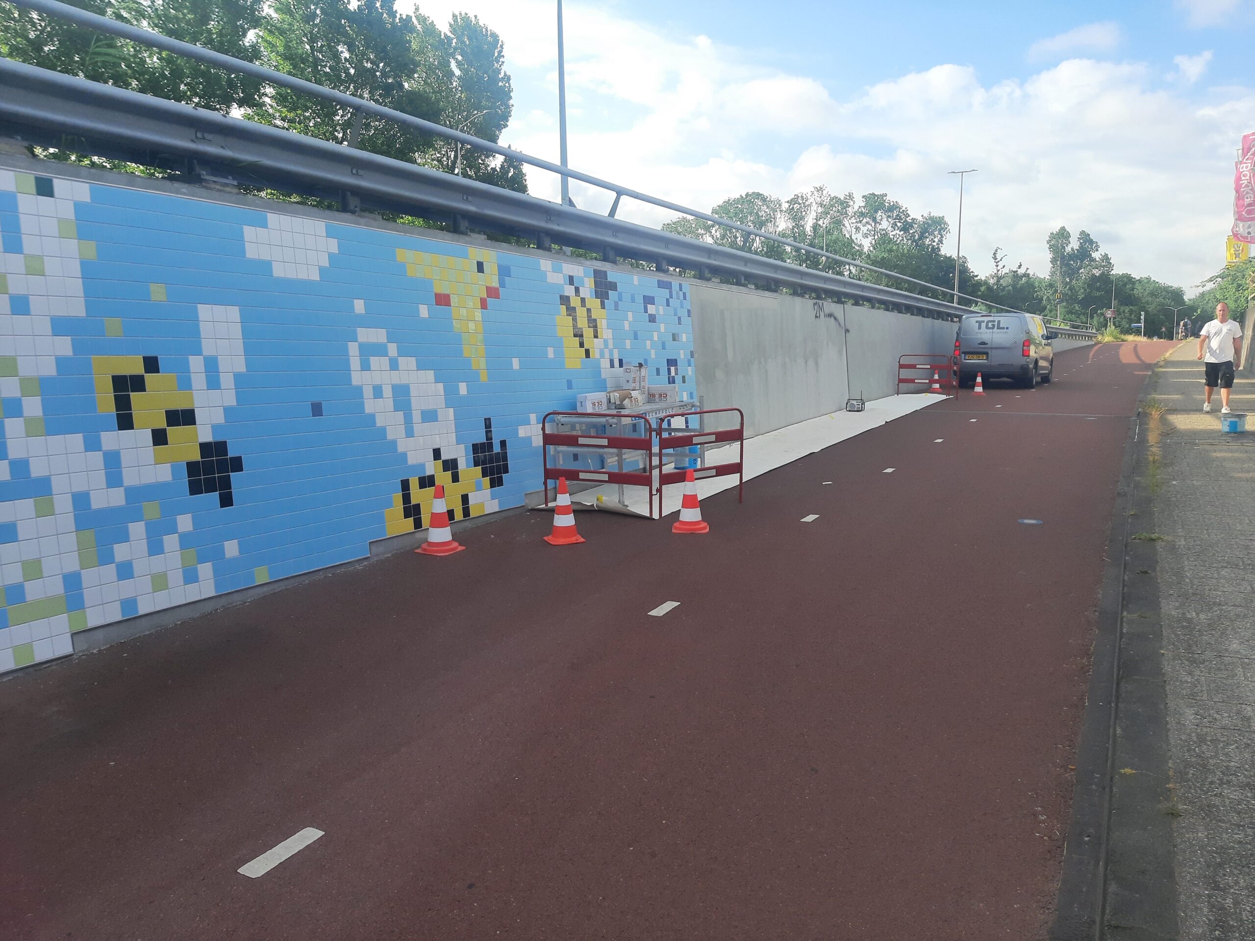 Op de fiets naar mijn werk in Amsterdam kom ik vlak voor de Hempont die me het Noordzeekanaal overzet, door een tunneltje met aan één wand een prachtig tegelmozaïek. Een deel van de wand is een paar jaar geleden spontaan naar beneden gevallen. Maar inmiddels is een van onze adverteerders in De Ronding met een aantal tegelzetters van TGL – Tegels en Tegelzetters het mozaïek geheel aan het restaureren.